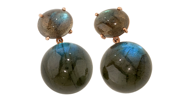 Our Double Gumball Earrings pair labradorite's ethereal flash with stunning proportion.