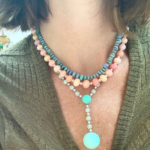 Irene layers her Green Opal Lariat Necklace with Full Cut Diamonds, with her One of a Kind Necklace with Conk Beads and Full Cut Diamonds and her One of a Kind Beaded Opal Necklace.