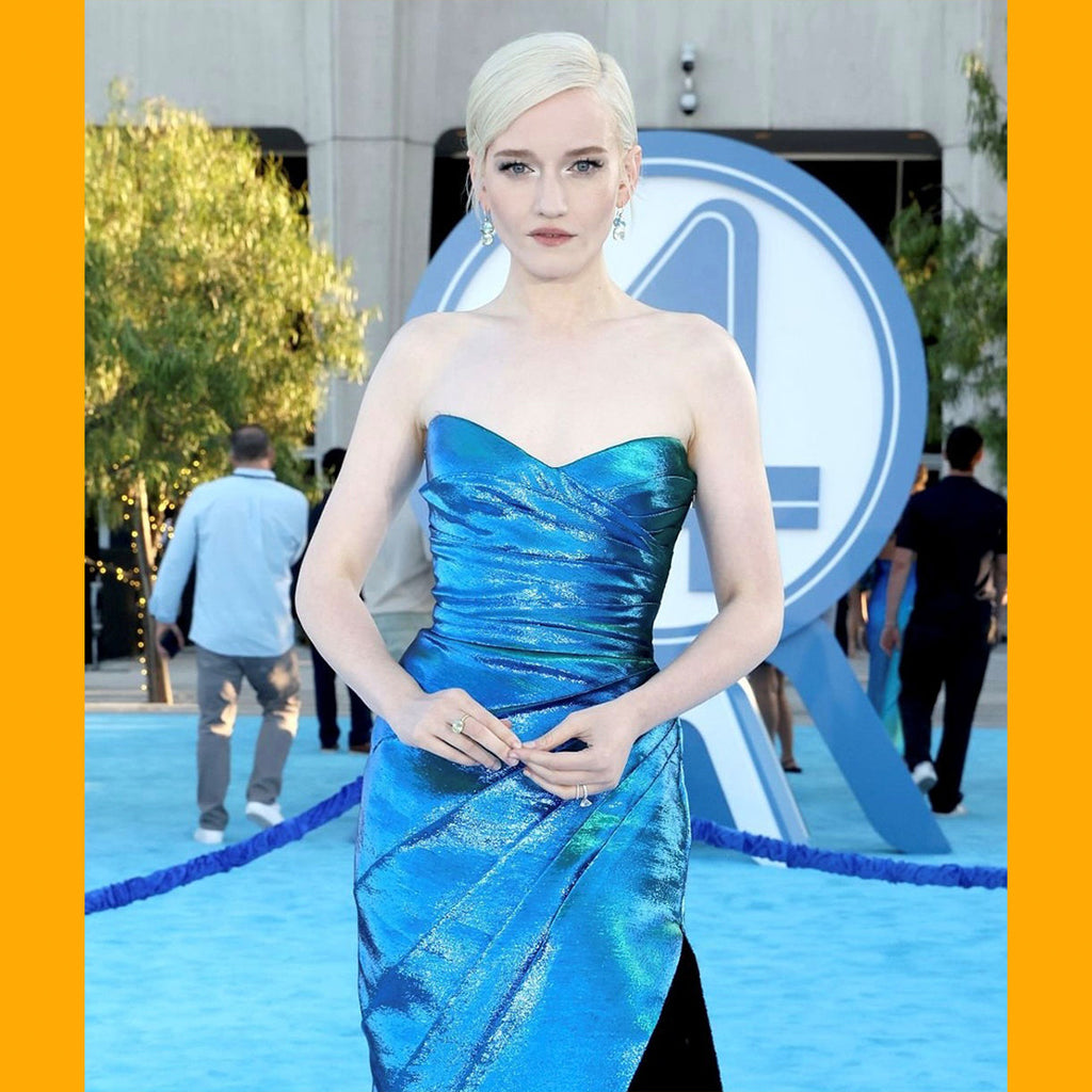 Julia Garner wore our One of a Kind Gemmy Gem Green Tourmaline and Aquamarine Double Stone Earrings and One of a Kind Gem Drop Oval Green Tourmaline Double Prong Ring to the world premiere of her new film, “The Fantastic Four: First Steps.”